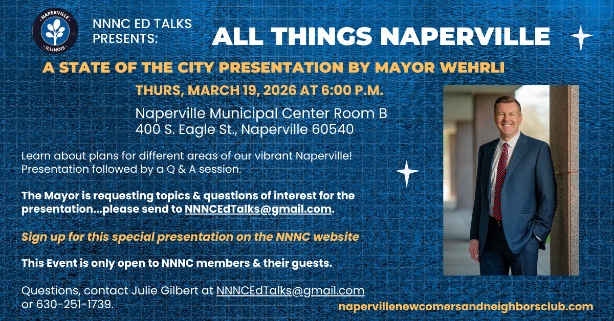 Our 300+ members have lived in the Naperville area for days or decades, range in age from 30+ to 80+, and have diverse backgrounds and interests. What we have in common is the desire to explore the opportunities that surround us. Naperville has a huge number of outdoor, cultural, educational and entertainment choices to offer. Why not explore them with new friends made at the Naperville Newcomers and Neighbors Club? We all have our unique experiences and talents to share!