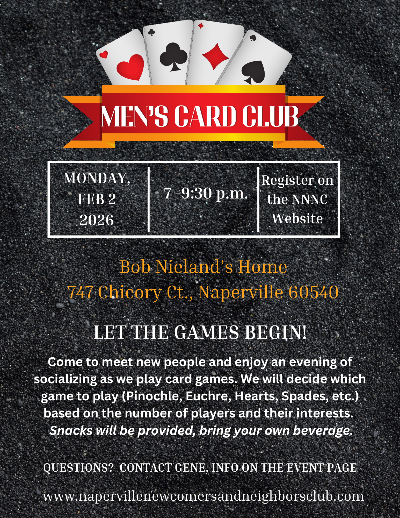 Whether you are new to Naperville or a long-time neighbor of the area, we would love to have you join our club and be part of the wonderful life here in the area. We have many activities and events throughout the year, so joining the NNNC is your bridge to fun and friendship.