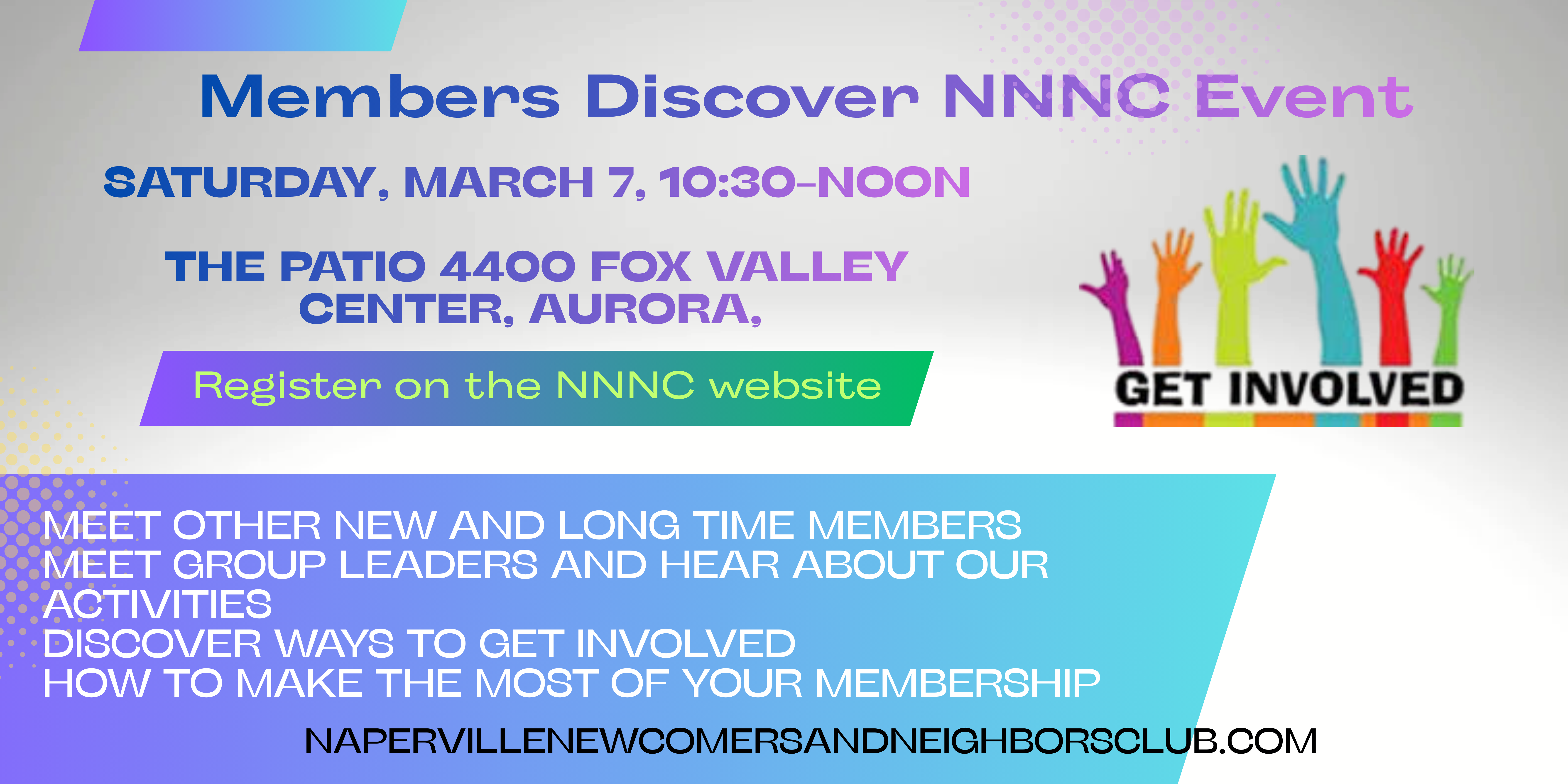 Naperville Newcomers and Neighbors Club is a non-profit, community organization welcoming newcomers and established residents of Naperville and the surrounding areas. Members meet and create friendships by participating in social, educational and charitable activities. Get to know us at a bi-monthly Discover NNNC Coffee, and then choose from a wide selection of activities. We have something for everyone! NNNC hosts more than 40 different activity groups as well as Welcome Coffees, special events and volunteering opportunities. Our Homepage and Event Calendar will give you a complete look at our current and upcoming schedule.
